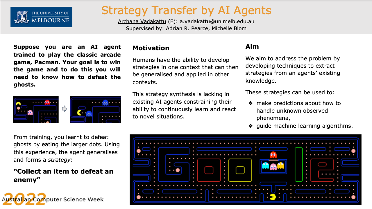 Previously, I completed a Bachelor of Electrical and Electronic Engineering (Honours) with a Bachelor of Mathematical and Computer Sciences (Computer Science Major) at The University of Adelaide in 2018. Before starting my PhD, I worked as a computer scientist in industry for two years, where I developed an interest in cognitive agent research.
